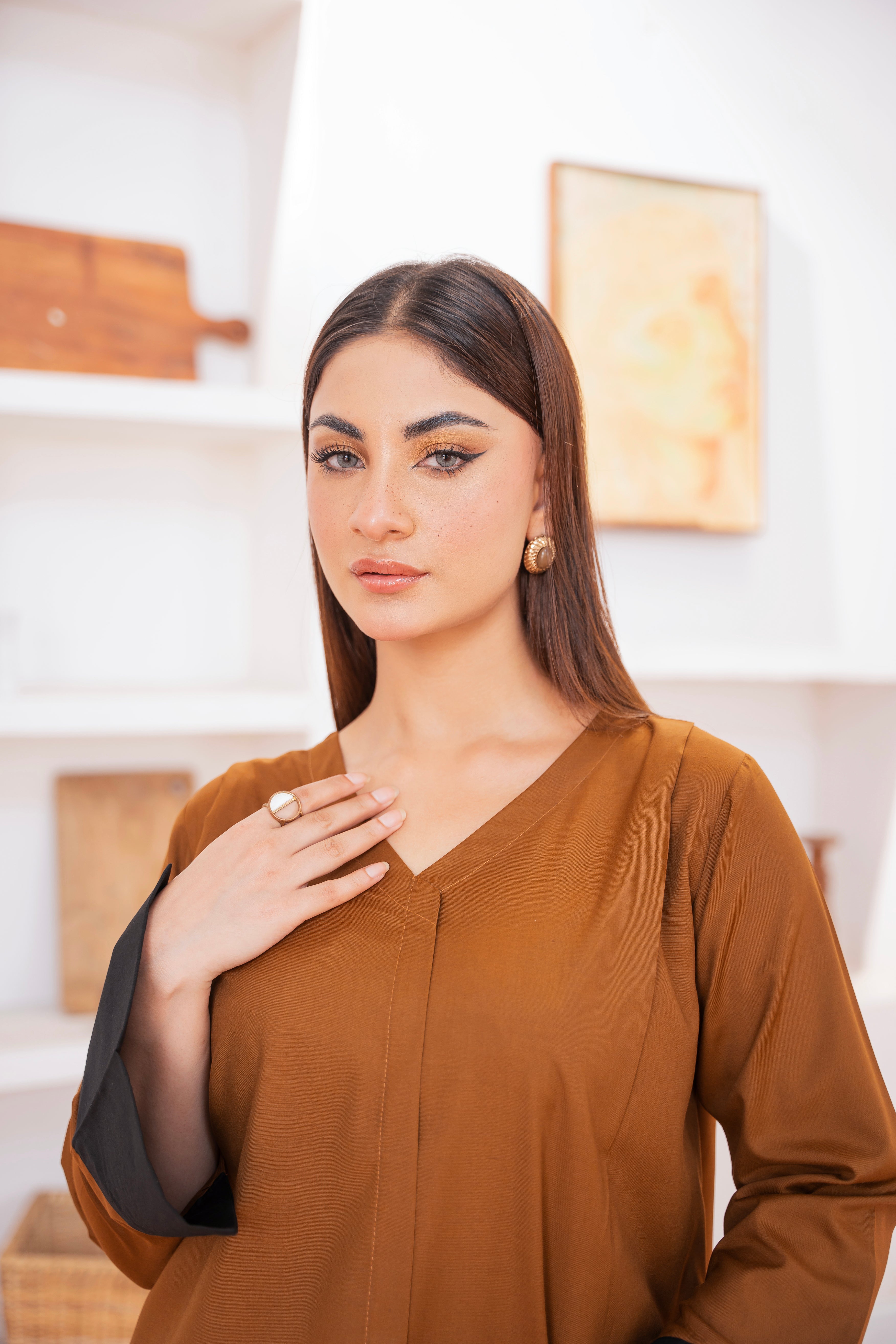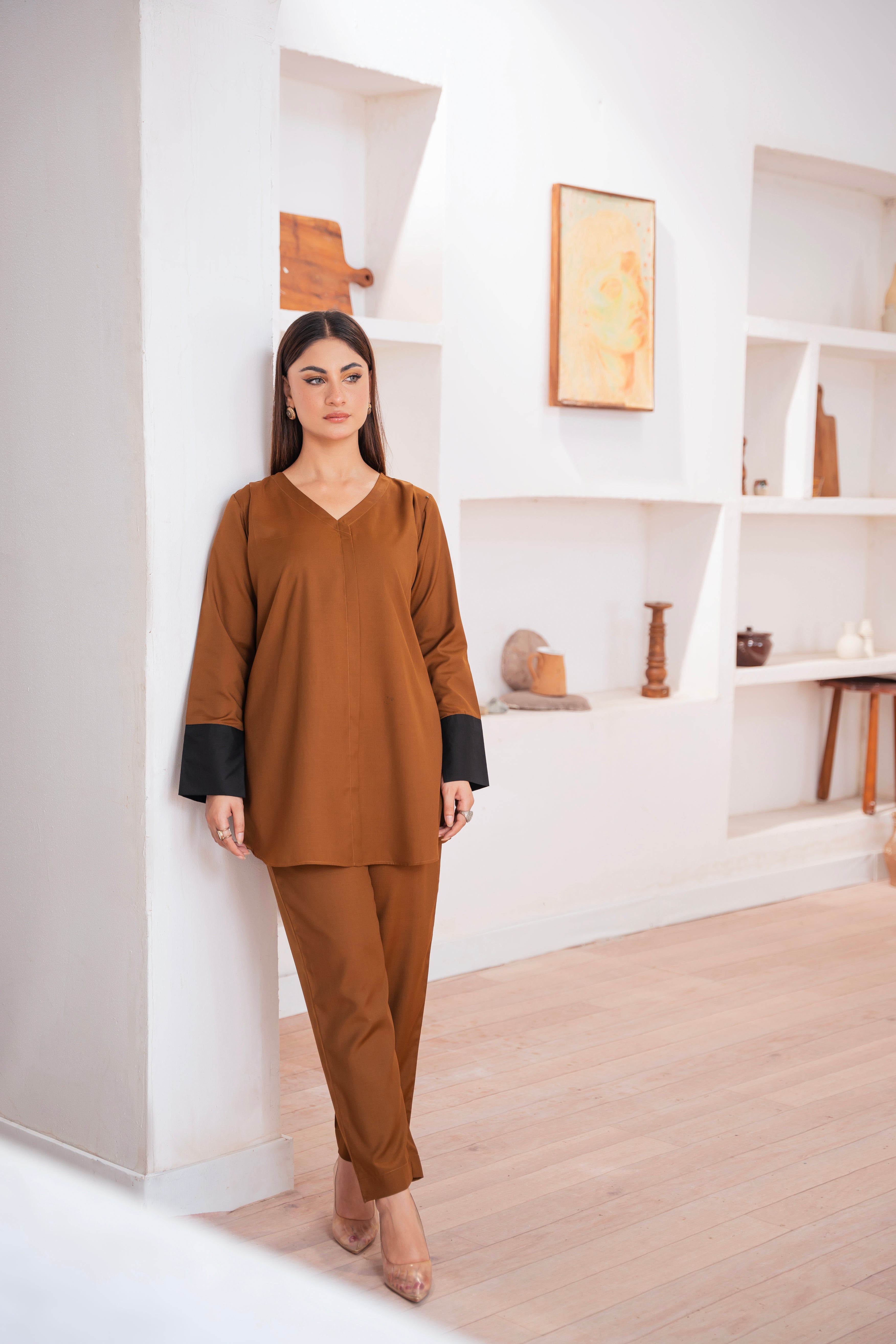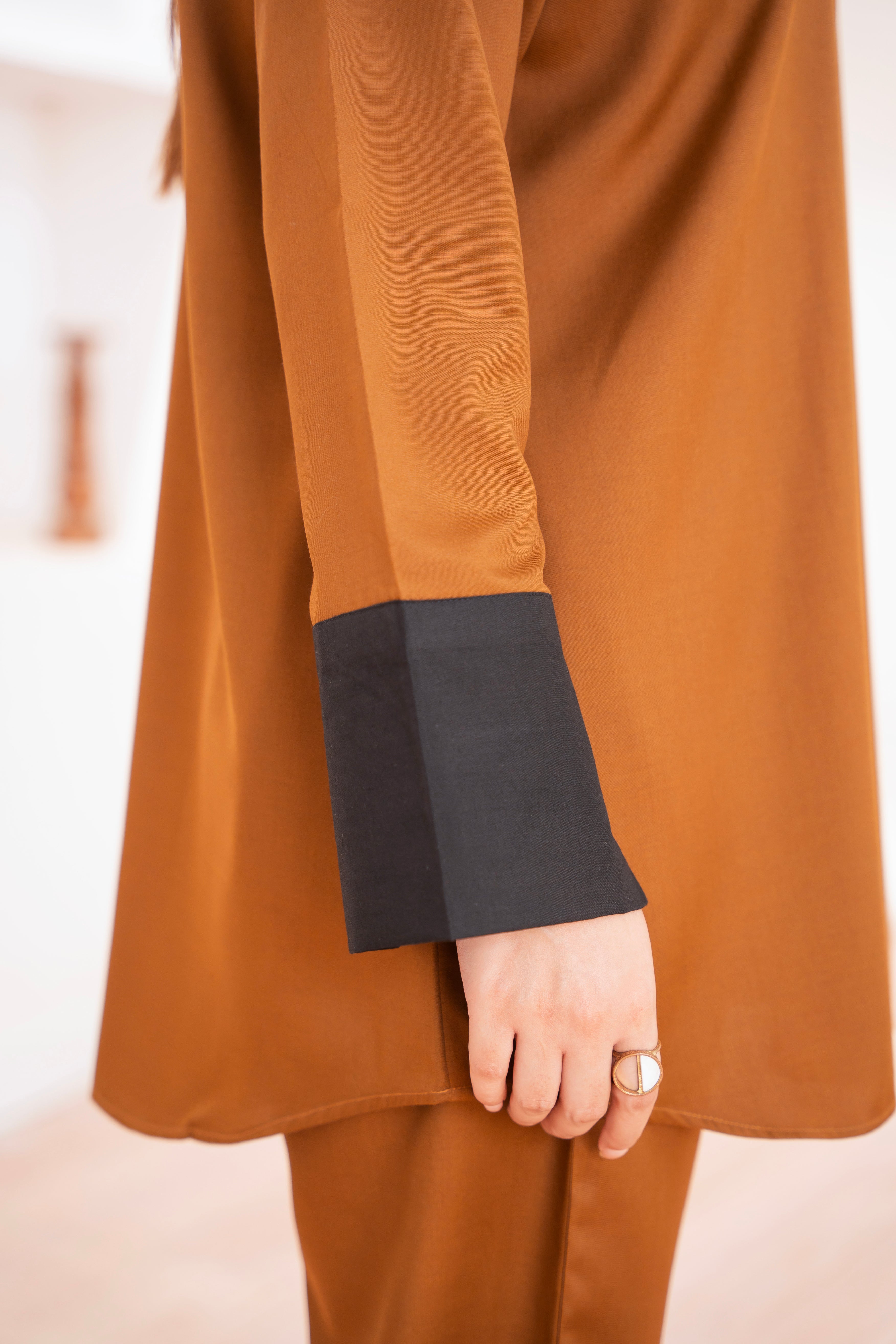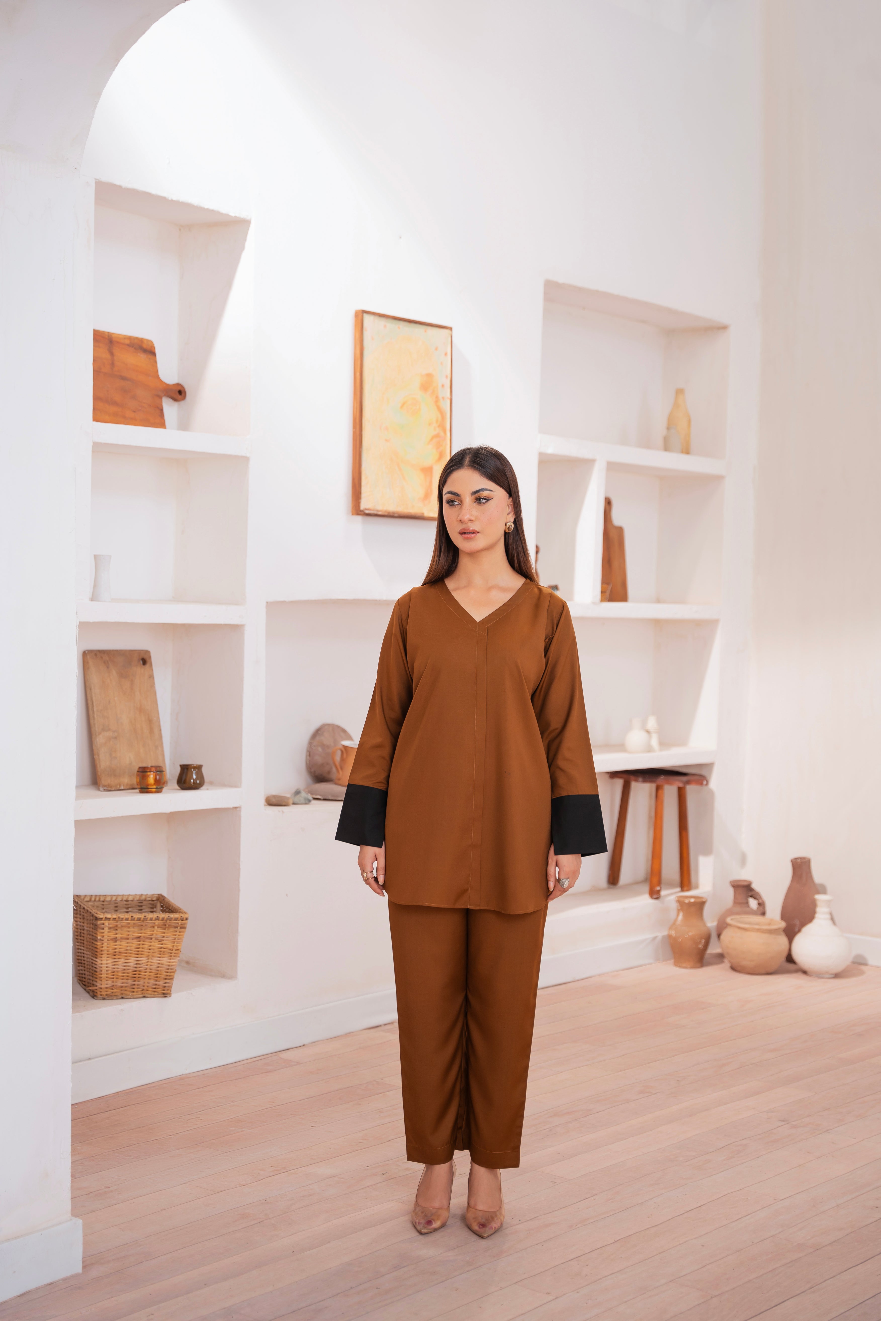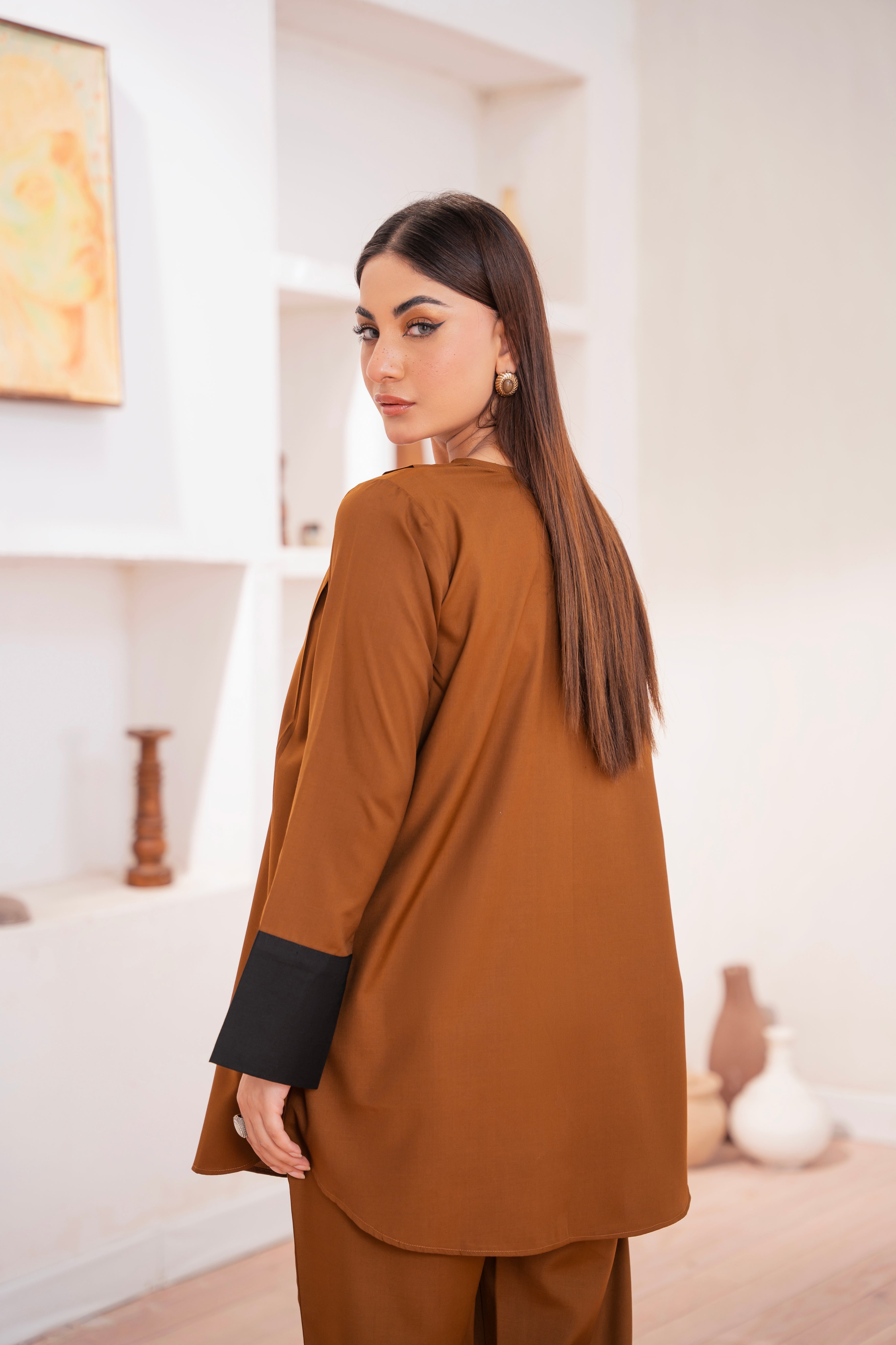 This two-piece dress includes a stylish shirt and tailored trouser. This dress is crafted from our new soft crepe fabric, known for its sweat-absorbing properties, ensuring comfort throughout the day. Designed to blend contemporary Western styles with subtle traditional touches. The dress is shown here in size small, perfectly fitted on the model. Length of Shirt, Sleeve Opening & Shirttail are as per Design. Actual color may vary slightly from what appears on your screen due to lighting.