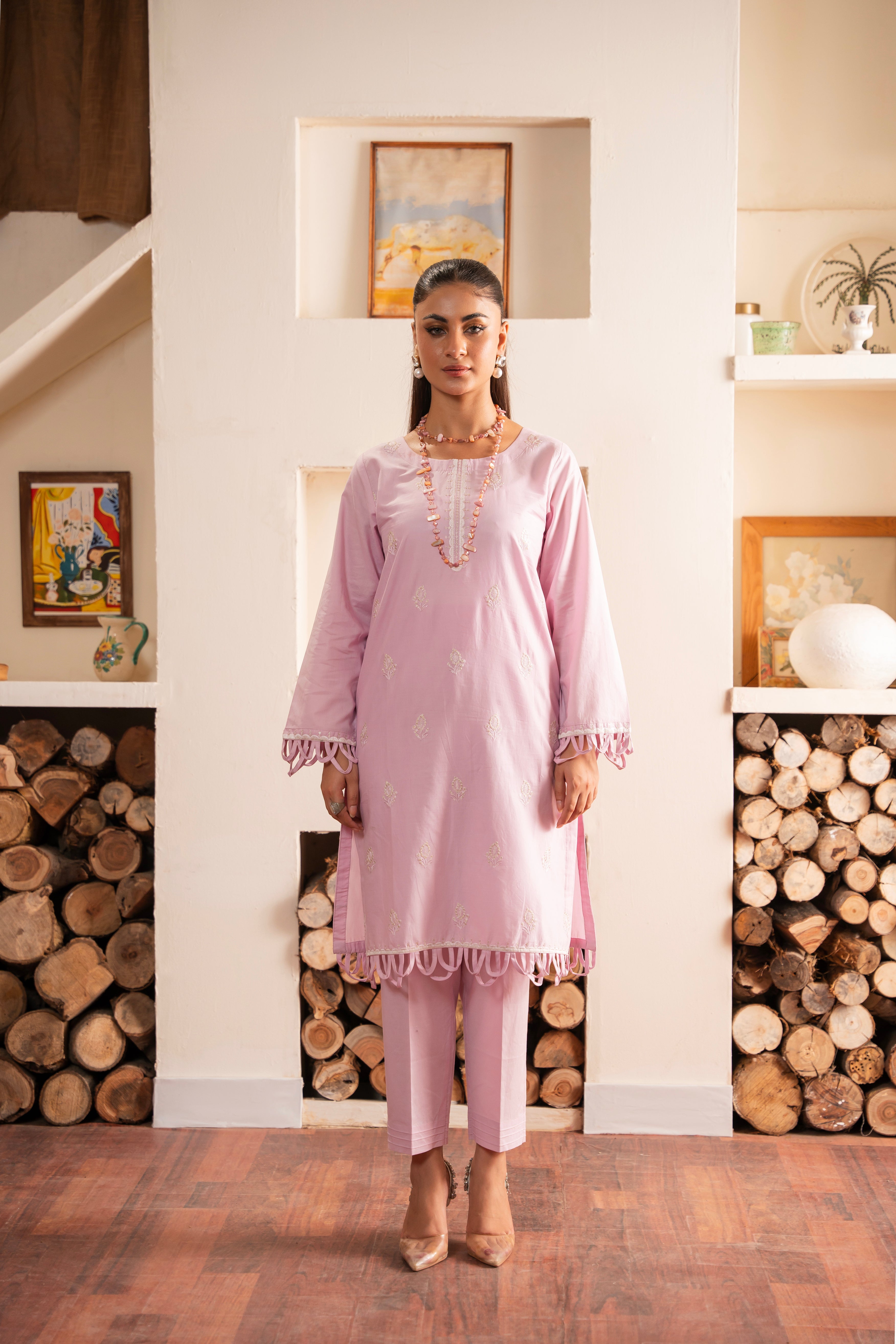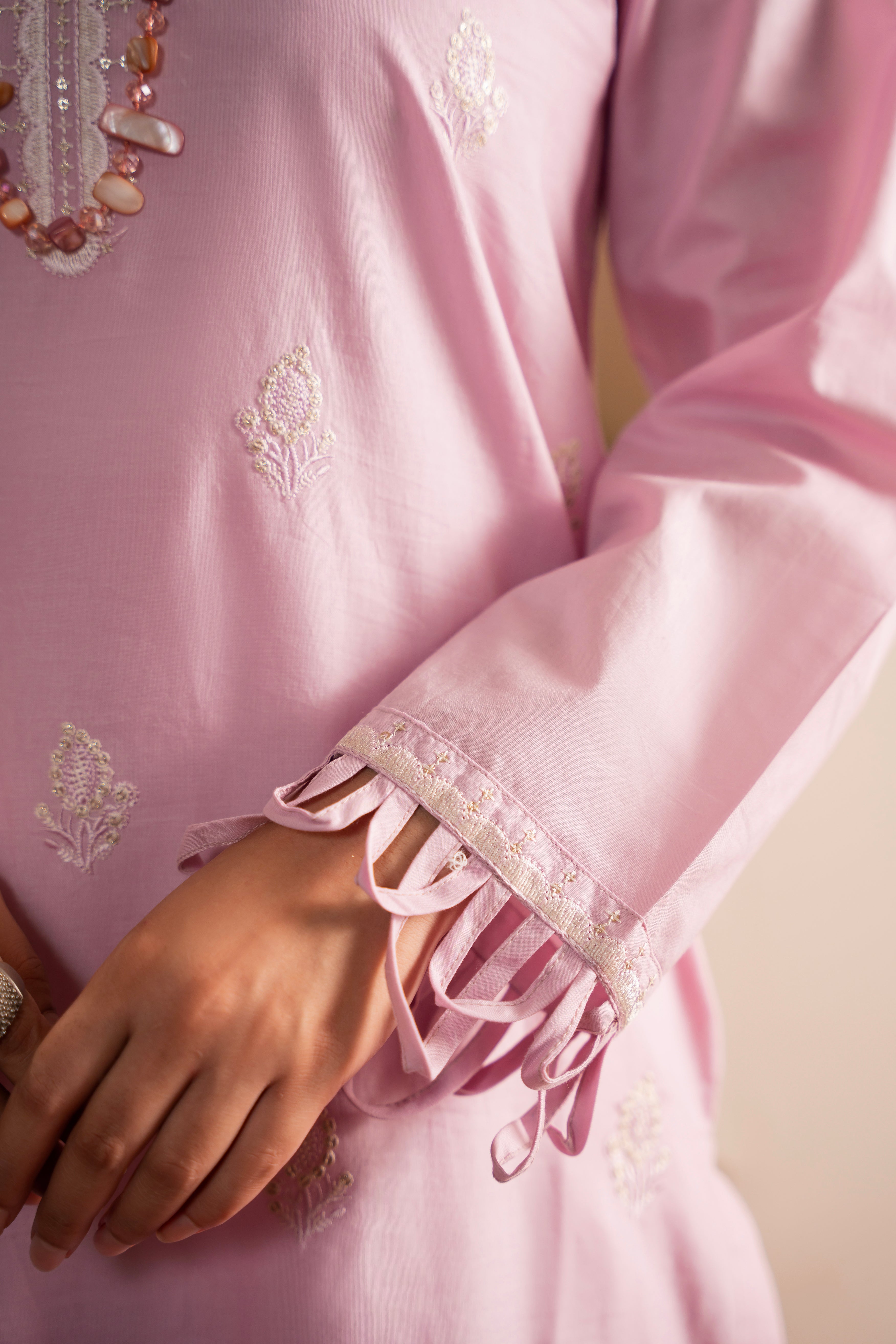 • It is adorned with embellishments along the front, with a beautifully detailed neckline and sleeve openings.